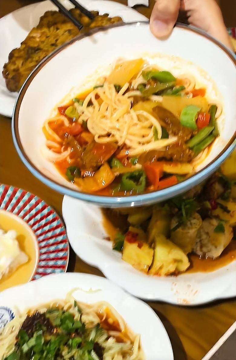 他举起手机,一一道来每一道菜的做法:首先是自家手擀的拉条子,面条筋道爽滑,浇头丰富浓香,青椒肉丝、番茄鸡蛋、辣子鸡丁层层堆叠,色泽油亮,香气仿佛透过屏幕扑面而来,比街头的小店更具诱惑力。视频中的画面传递出一种浓浓的家乡味,温暖而真实。