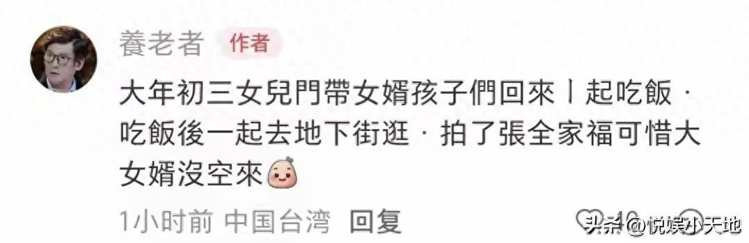 网友们纷纷评论说,郭碧婷的爸爸家真是人丁兴旺,三个女儿带回了三个女婿和七个外甥,大家聚在一起,气氛热烈。如果向佐也能到场的话,这个家庭的成员就达到了14个人,吃饭时完全可以分成两桌。对此,郭碧婷的爸爸也坦言,自己已经过上了非常幸福的生活,三位女儿都非常孝顺,尽管向佐因工作繁忙常常不能陪伴在身边,但其他女婿们则总是时常出现在家里,带来不少欢乐与温暖。