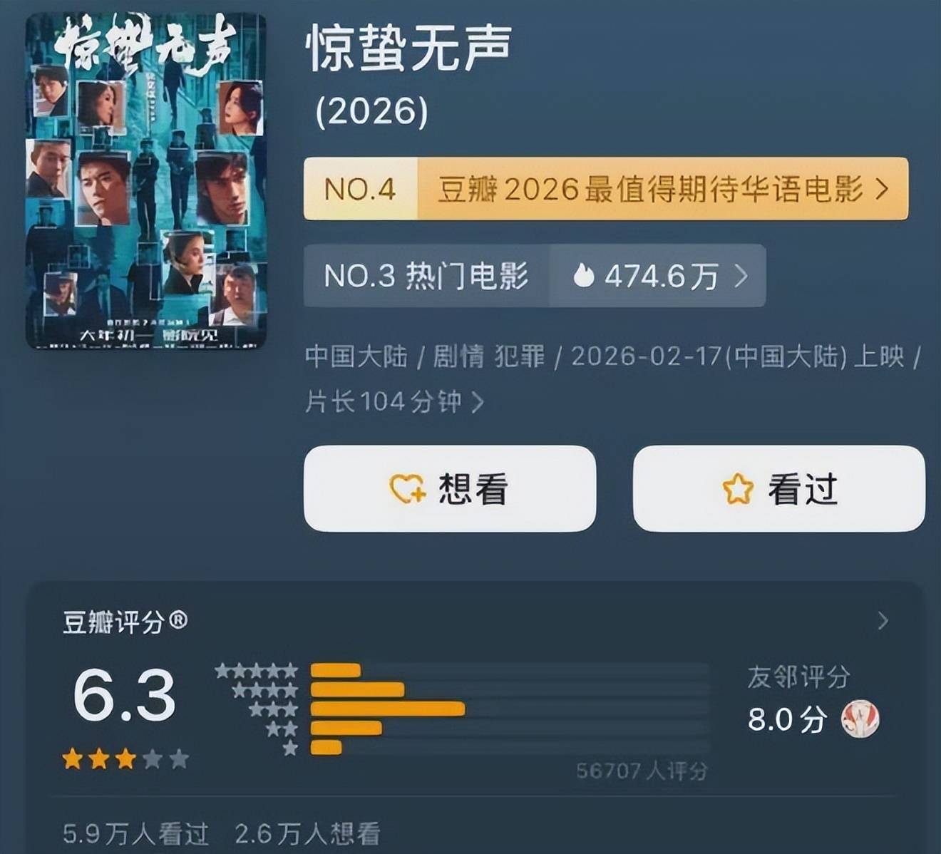 宣发的错位,让影片彻底偏离了轨道。片方主打 “首部当代国安”“『张艺谋』谍战”,拉高了观众的期待,结果成片偏严肃、偏主旋律,娱乐性严重不足。春节档的观众,要么想图个合家欢,要么想看得酣畅淋漓,《惊蛰无声》既没有《飞驰人生 3》的热血搞笑,也没有《镖人》的硬核打戏,更没有《熊出没》的亲子欢乐,高不成低不就的定位,让它在春节档的厮杀中,彻底失去了竞争力。