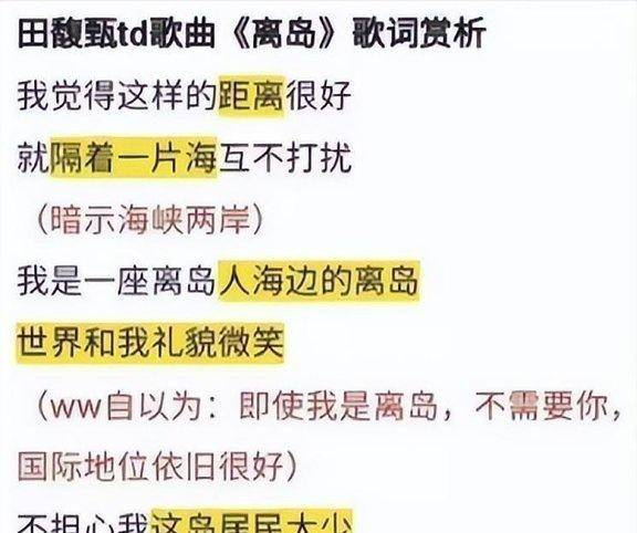 可她有时候说话让人摸不着头脑,发个吃意大利面的照片,配文“不用硬撑,意大利面好吃就能扳回一城”。引发争议。还有和意大利人合唱的事,歌词里小心思多。