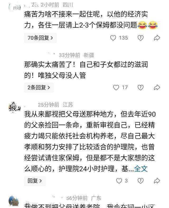 尽管养老院条件优越,但李幼斌始终感到缺乏家的温暖。他每年都会回长春好几次,带着父母喜欢的零食,先去看父亲,再去看母亲。父亲房间里挂着一张老式的钟表照片,他每次去都会和父亲聊起当年厂里的事,父亲总是点头听着。而母亲则需要护士帮忙喂饭,记忆力也越来越差。2024年,父亲摔了一跤,李幼斌正在外地拍戏,得知消息后立刻赶回去处理。他坦言,尽管养老院能提供良好的医疗和服务,但那种无力感始终存在。钱可以解决物质上的问题,买到设备和专业服务,却无法买回父母年轻时的和气与温暖。网友们对此产生了分歧,有的认为专业养老院更为实际,毕竟照顾老人更有保障;而另一些人则认为『明星』️应该亲自照顾父母,避免他们在孤独中度过晚年。