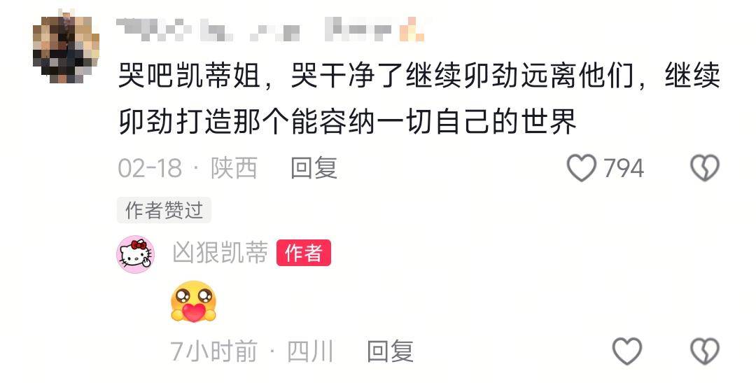 在哭诉的视频下方,不少网友安慰了凶狠凯蒂,表示凯蒂已经很棒了,看到了她的努力。