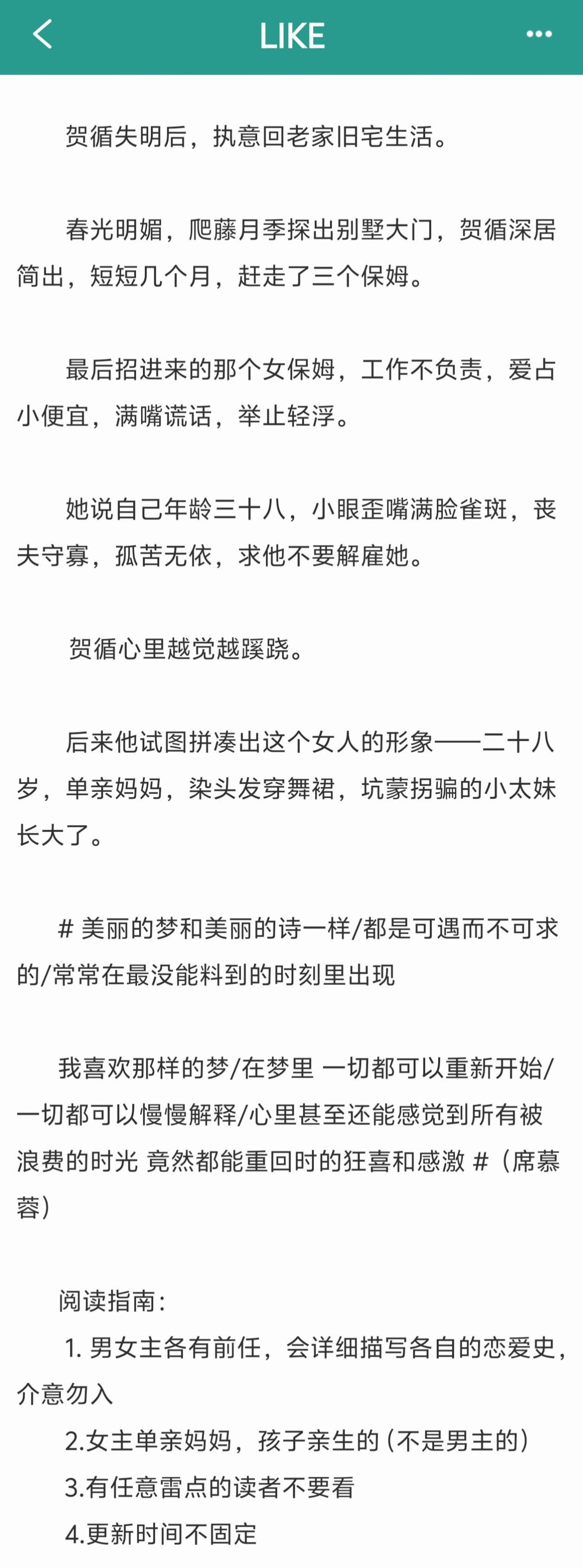 后来她做礼仪兼职时,意外听说一位失明的大老板来小城定居,正高薪急招保姆,只是这人脾气难伺候,已经气走好几个。女主一听高薪心动了,心里还默默盘算:盲人好糊弄,她掐着时间差直奔别墅应聘,为了符合年龄要求,直接谎称自己四十多岁。凭着一张能说会道的嘴,一顿天花乱坠的自我推销,硬是把老板说动,顺利留下试用。