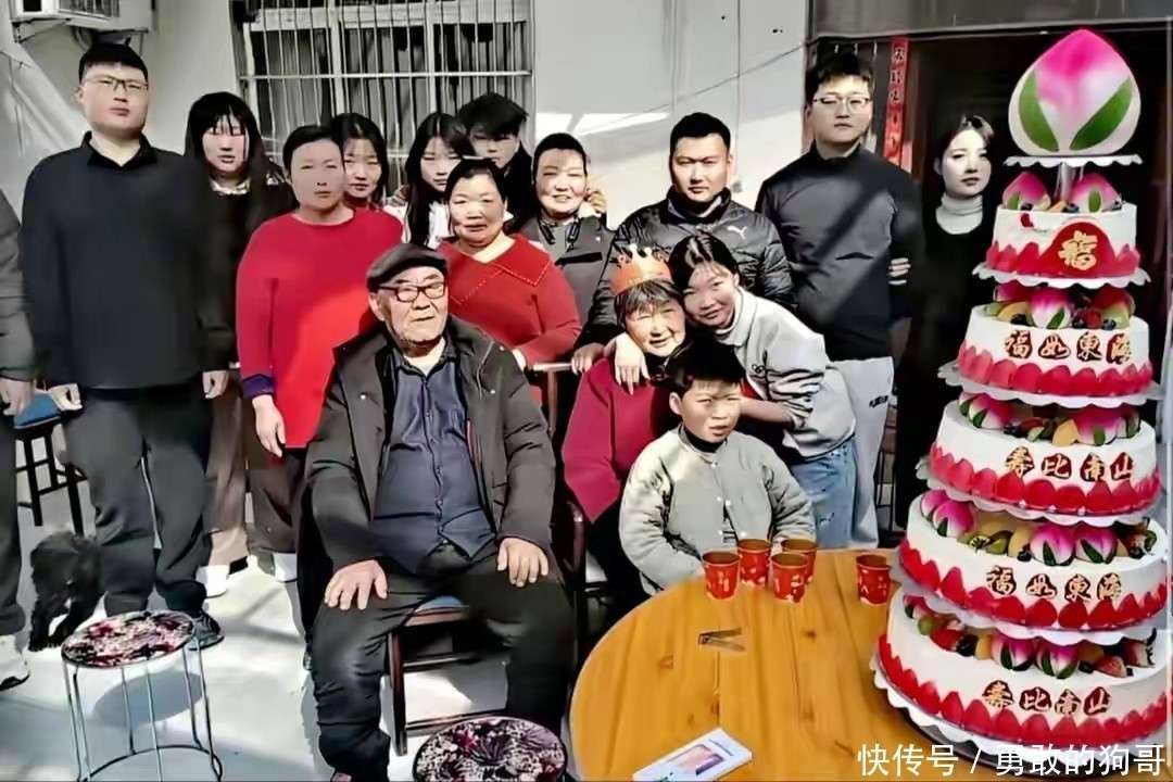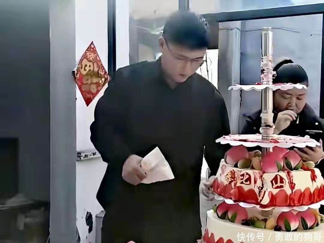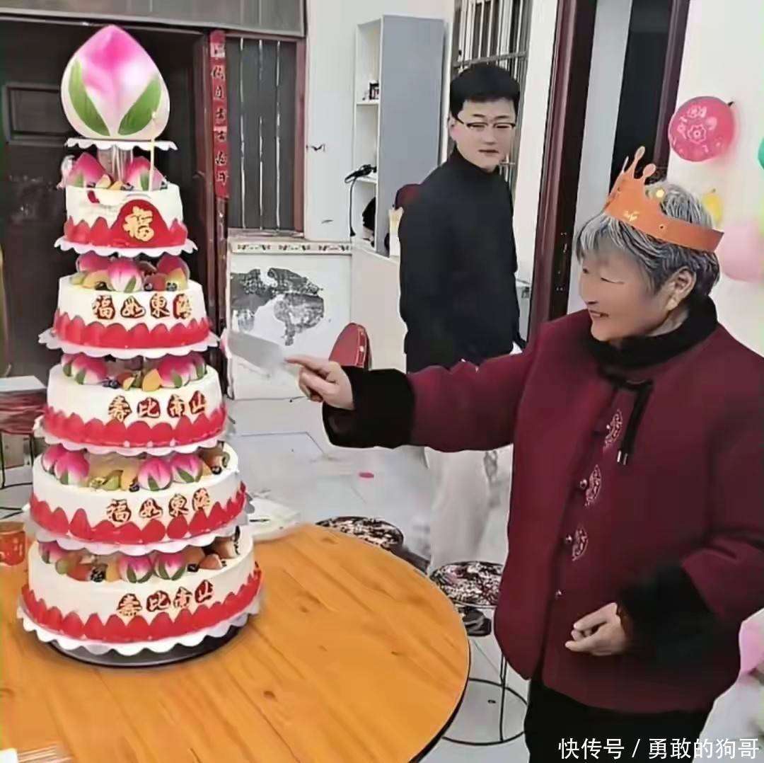 寿宴上最显眼的,莫过于那个六层高的寿桃蛋糕,上面写着福如东海,寿比南山的祝福语,最顶上放着一个大大的寿桃,看着非常喜庆。对于普通农村家庭来说,准备一个两层的蛋糕就已经相当体面了,而这个六层的蛋糕,无疑花费了不少心思和钱财。