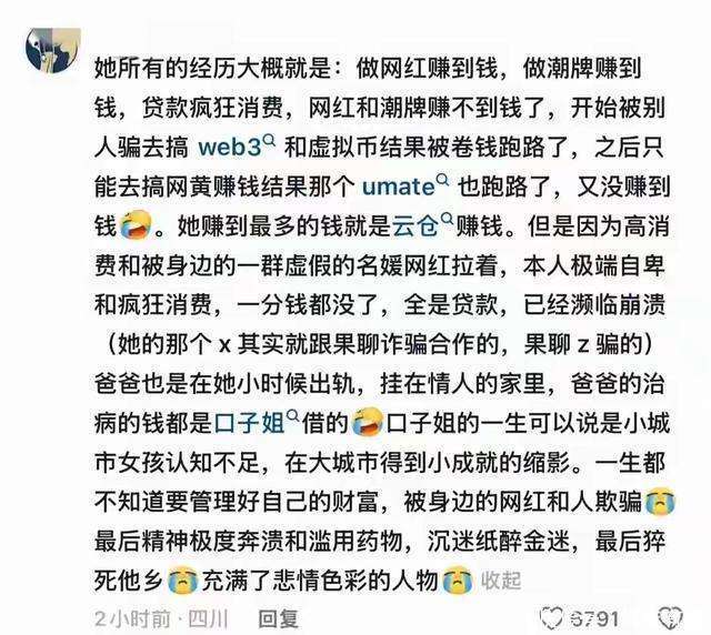 尽管她年仅29岁,但她的人生似乎已经历尽了世间百态。从小经历父母离异的痛苦,再到网红暴富的快速崛起,接着被亲密的朋友和闺蜜背叛,最后不仅破产,还在直播中自曝得了梅毒,甚至亲自展示了因病溃烂的手臂。最后,命运开了个残酷的玩笑,她竟在意外中猝死在他乡。人生如此匆匆,结局如此悲凉。