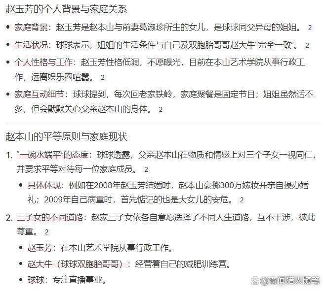 球球以前也提到过姐姐的事,但大多数时候她选择不去多谈,她说这不是在回避什么,而是出于对赵玉芳的尊重,因为赵玉芳自己不愿意出现在镜头前,她就配合着保持沉默,家里三个孩子生活条件都一样,回铁岭老家吃饭也从没分过桌,球球讲这些的时候语气很平静,就像在说今天吃了什么饭一样,并不是为了澄清那些传言。