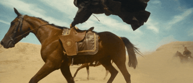 沙漠里没有边界感,天地都是空的,十几匹马在黄沙里全力狂奔,蹄声、风声、沙尘翻滚的声音混在一起,形成一种排山倒海的压迫。