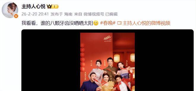 2026年春节联欢晚会结束后,许多主持人纷纷通过『社交平台』分享感慨与心情,唯独小撒未见发文。刘心悦,这位中央广播电视总台综艺频道的知名新生代女主播,在2月20日晚20:41时,发布了一条带有幽默风趣的文字:我看看,谁的八颗牙齿没晒晒太阳。紧接着,她还上传了一段时长20秒的短视频,记录了她在春节档期间的工作和表现,其中包括她在2026央视春晚的主持片段。视频中的每一个瞬间都值得我们关注。