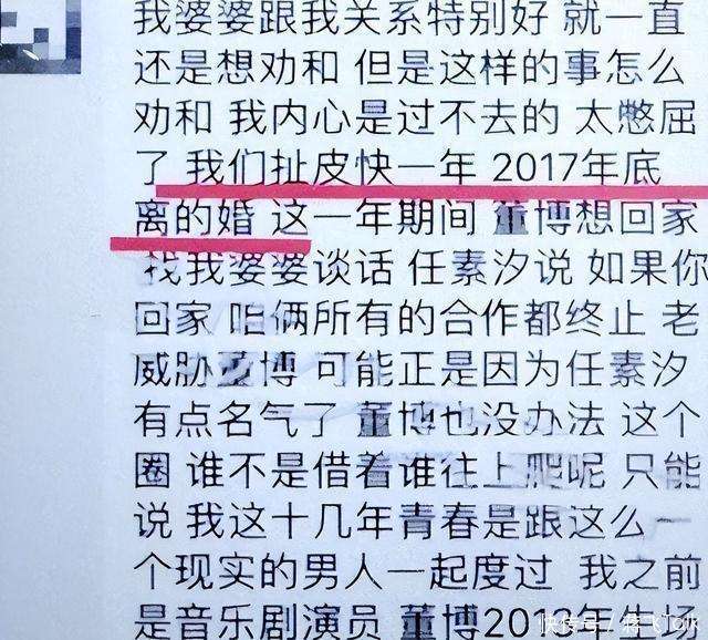马琦雅表示,自己虽然于2017年底和董博离婚,但早在2016年,她就发现了董博与任素汐的关系。当时,她找到了董博,面对面对质,没想到丈夫竟然坦然承认了自己的背叛,而且并不想结束这段不正当关系,反而请求离婚,让马琦雅成全他。两人为了离婚事宜纠缠了一年多,而在这期间,任素汐与丈夫李洋也在2016年宣布离婚。