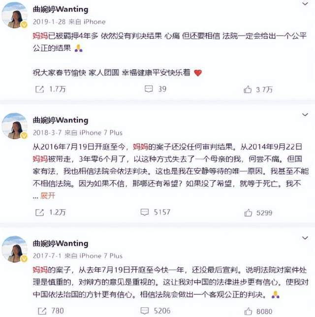 这么多年来,曲婉婷在『社交平台』上,分享过自己的奢华日常,为母亲喊过冤,甚至还试图靠卖惨博同情,可她从来没有,向那些被母亲伤害过的下岗职工,说过一句对不起,从来没有想过,要退还一分赃款。