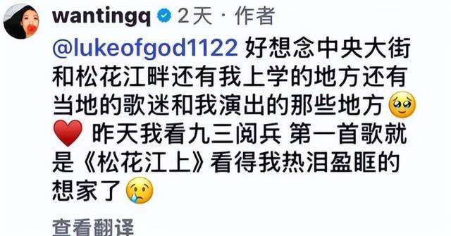 2025年9月,她在『社交平台』发文,说自己“想念松花江上的家乡”。