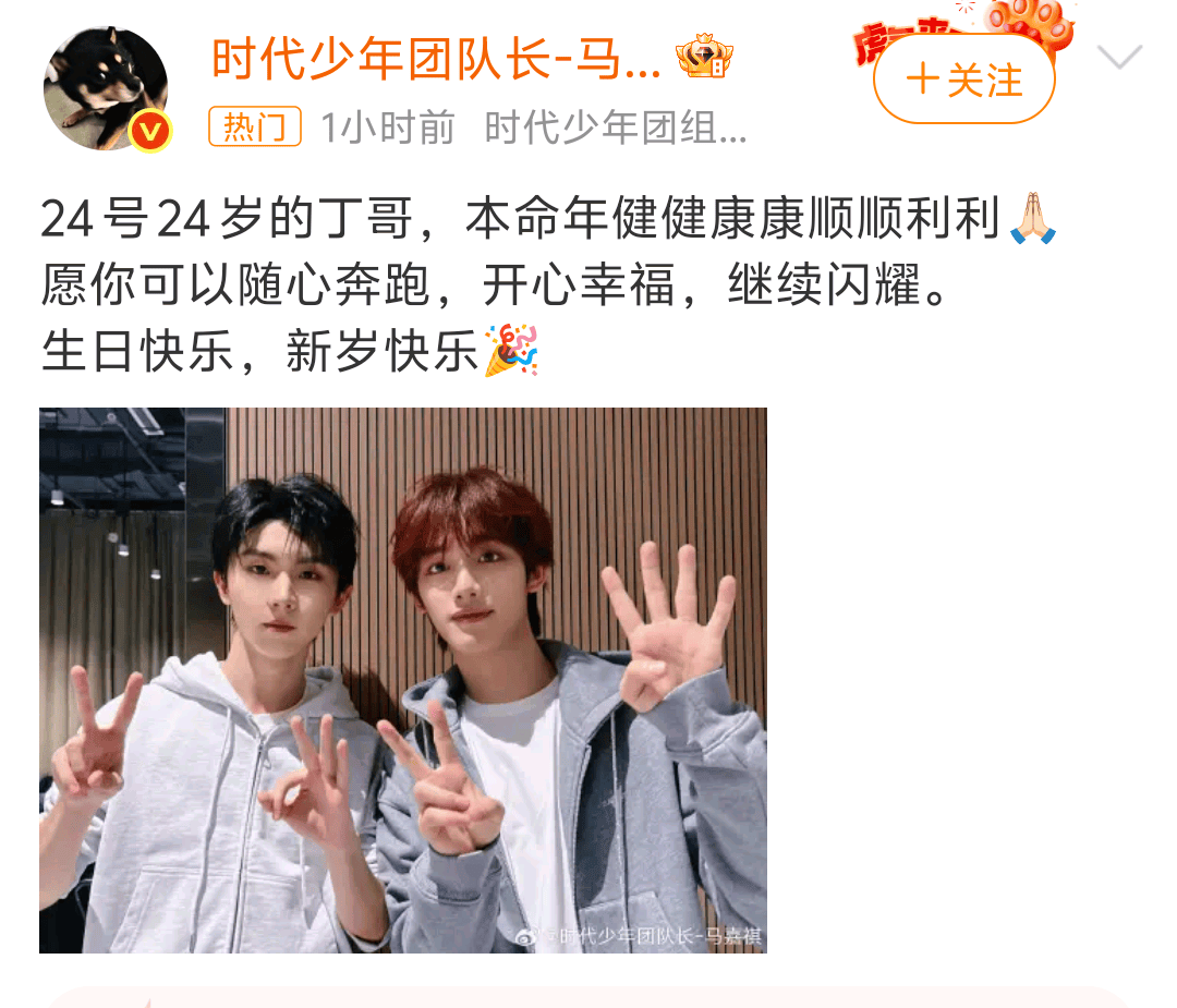 当2026年2月24日的零点钟声敲响,时代少年团队长马嘉祺的微博准时上演"年度大戏"——为本命年24岁的丁程鑫送祝福,愣是把生日过成了全网吃瓜的连续剧。这对"相爱相杀"的兄弟用"手比年龄数字"的祖传仪式,成功让#马嘉祺丁程鑫年龄手势杀#冲上热搜,网友直呼:"这默契度,怕是连双胞胎都自愧不如!"