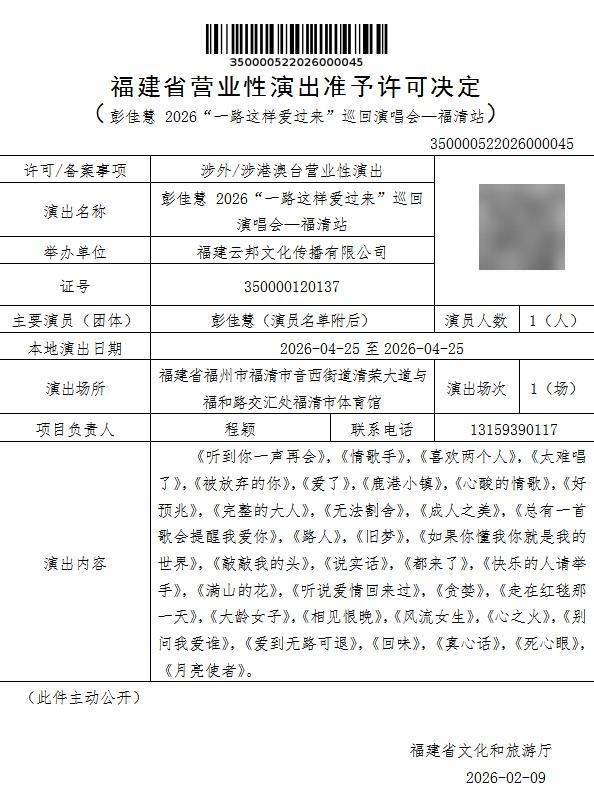 日前,彭佳慧2026“一路这样爱过来”巡回演唱会——福清站已正式通过审批。这意味着,今年春天,福清的歌迷朋友们将在家门口迎来一场音乐盛宴。
