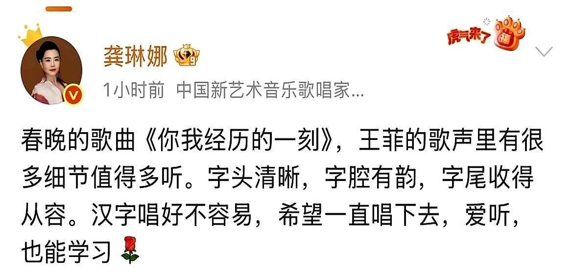 有意思的是,国内外著名歌手龚琳娜却率先表扬『王菲』,称“春晚的歌曲《你我经历的一刻》,『王菲』的歌声里有很多细节值得多听。字头清晰,字腔有韵,字尾收得从容。汉字唱好不容易,希望一直唱下去,爱听也能学习,