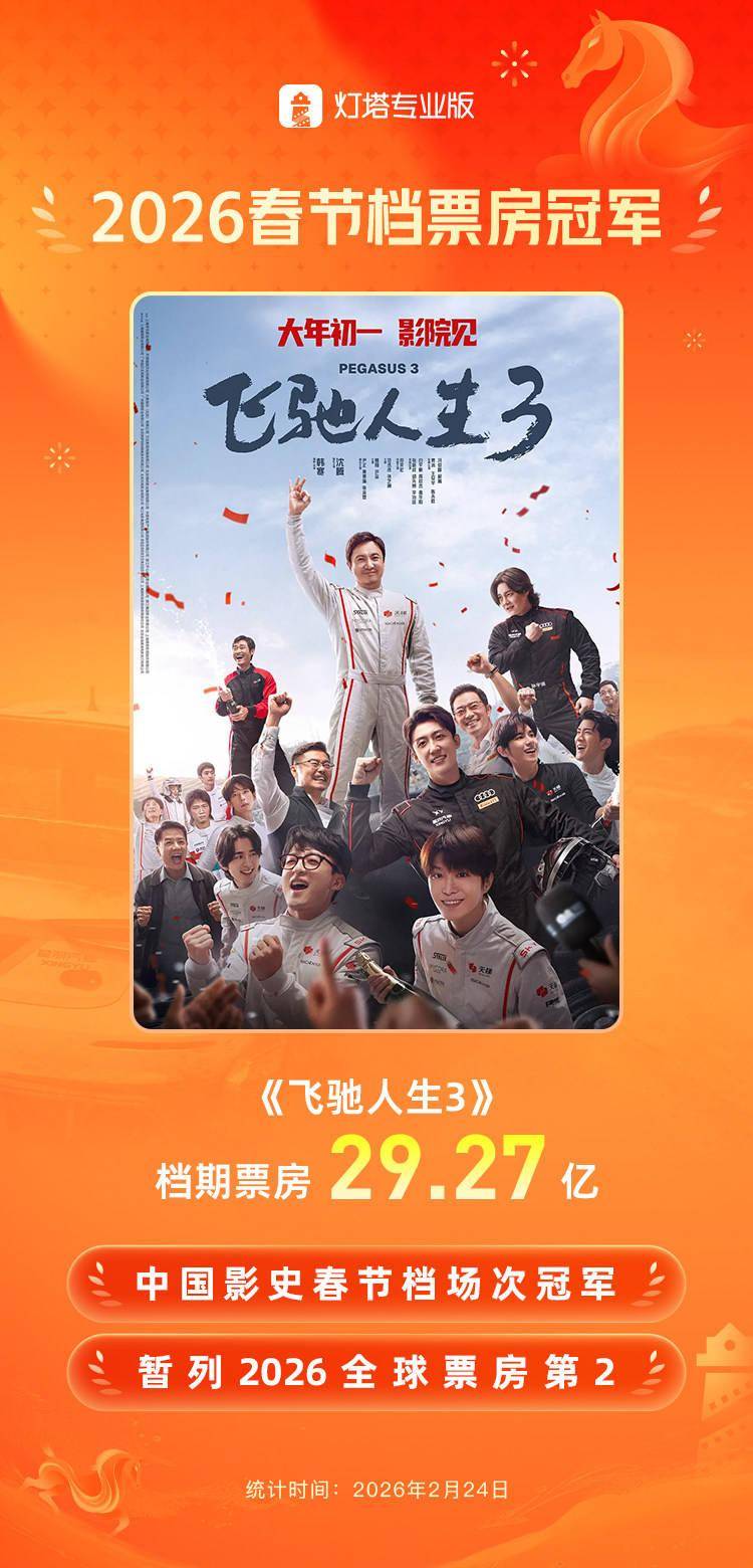 据国家电影局统计,截至2月24日9时,2026年春节档总票房57.55亿,总人次1.20亿,《飞驰人生3》成为春节档票房冠军!