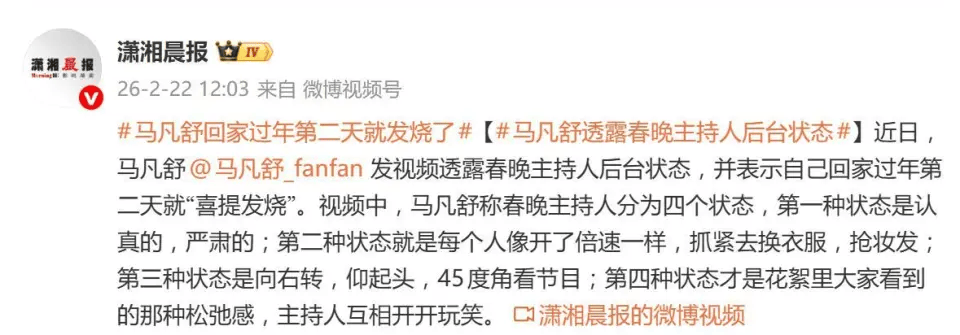 近日,央视主持人马凡舒的视频揭开了春晚舞台背后的另一面。她完成2026年春晚主持后返乡,次日便发烧,这让节后“中招”的网友深有共鸣:高强度运转后突然松弛,身体会“抗议”。