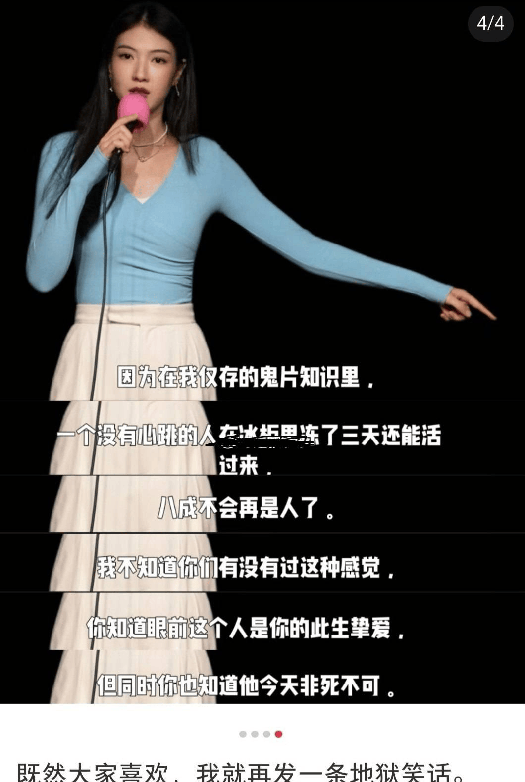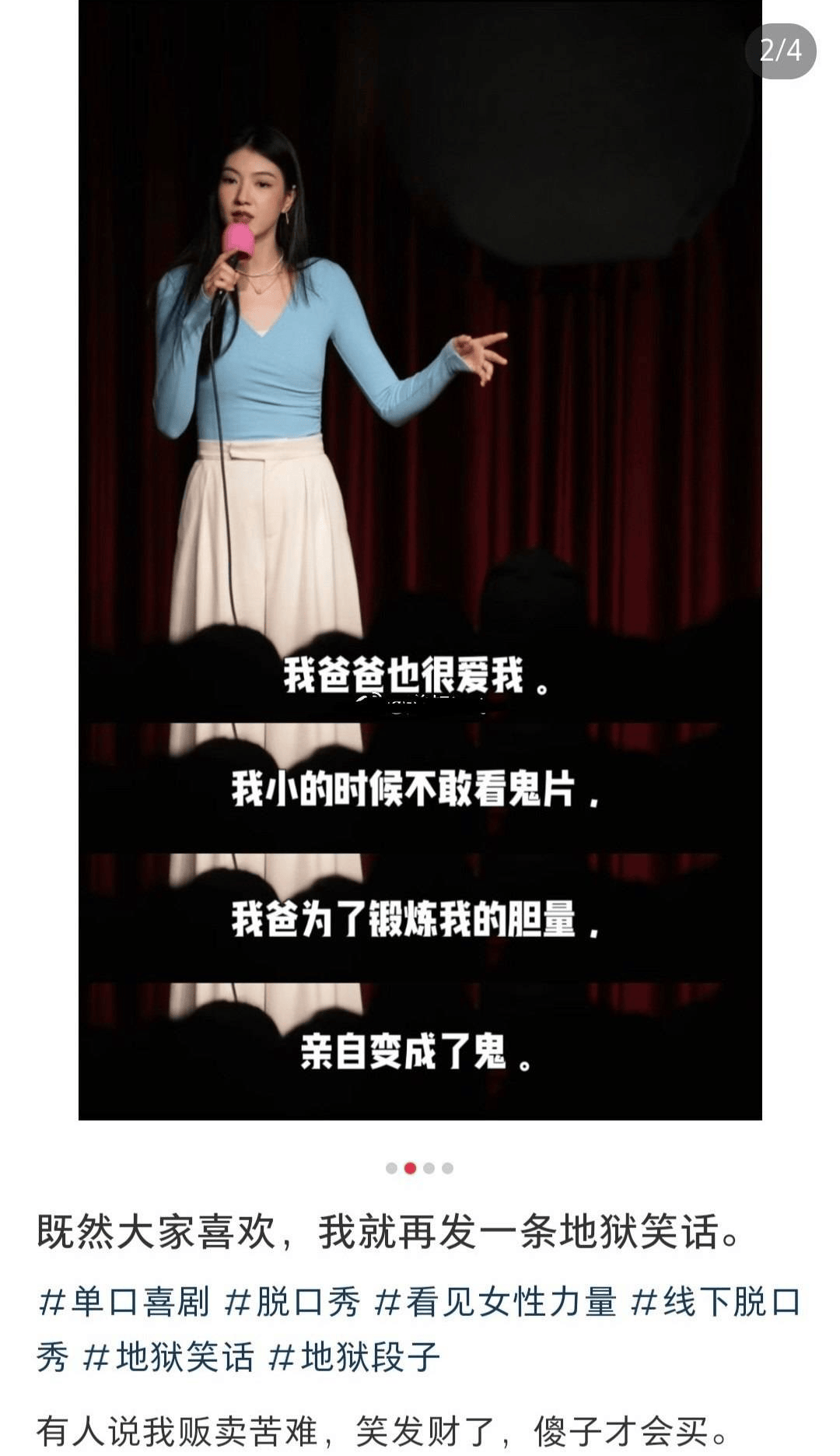 可这根本不是一回事。王大刀的段子里,藏着受害者的挣扎与抗争,是用幽默对抗痛苦,让观众在笑声中看见创伤、共情苦难;而纳吉尼的段子,只有冷漠的调侃和功利的算计,没有半分真诚,更谈不上疗愈——拿亡父消费,从来都不是勇敢,而是无知与冷血;用死亡造梗,也从来都不是艺术,而是对逝者的亵渎、对观众情感的冒犯。