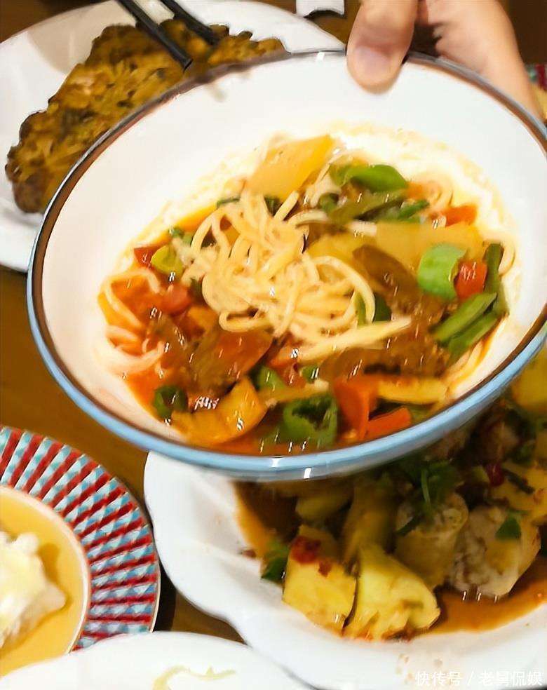 小尼还特意拿起手机,面对镜头给大家介绍桌上的美食。首先他提到了家里做的主食——炒拉条。虽然配料不算丰富,但那诱人的色泽让人垂涎欲滴,看起来比外面餐馆卖的还要香。