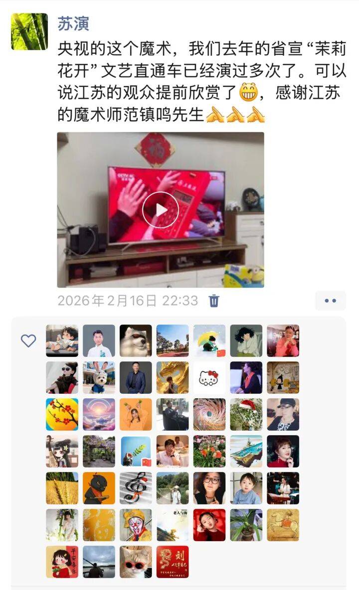 当春晚舞台上的魔术引发全国热议,陈东的朋友圈也被更多人看见。“看到春晚这个节目,我第一反应就是录下来发了那条朋友圈。”陈东笑着说,“不是要比较什么,就是觉得挺有意思——原来我们这一年在基层跑的节目,跟春晚舞台上是‘同款’。这说明咱们江苏的老百姓,在家门口看到的也是高品质的节目。”