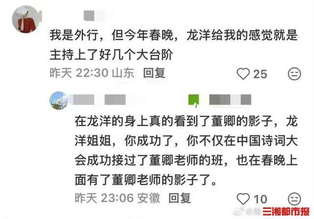 龙洋此次的春晚主持表现,引发了网友的广泛讨论,“龙洋主持完春晚哭了”的话题登上热搜高位。网友认可其大气的声线与现场控场能力,认为其舞台表现展现出了扎实的台风与文化积累;其舒展的舞台形象,也被不少观众评价为契合新春的喜庆氛围,与“国泰民安”的审美感受。不少观众感慨,从初次主持春晚的青涩到如今的游刃有余,能清晰看到龙洋在压力下的不断成长与进步。