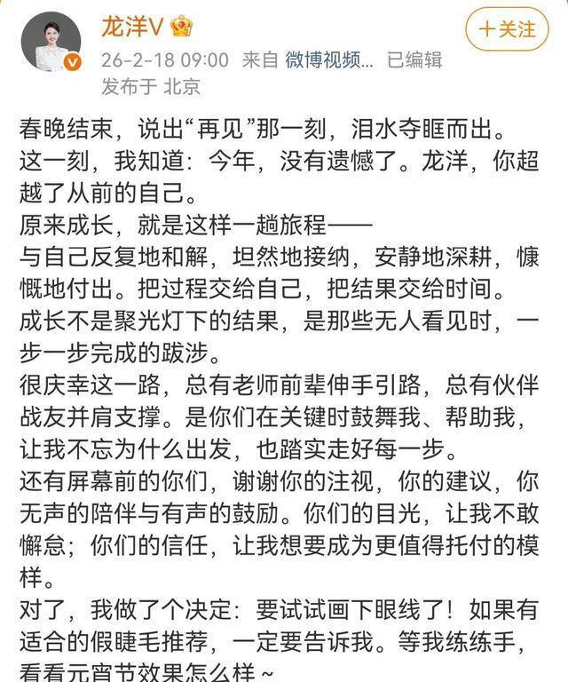 说到龙洋,36岁的她今年再次担任春晚的台柱子。不得不说,她的业务能力真的是数一数二,毫不夸张地说,是顶尖级别的。然而,在春晚直播中,她那双大眼睛却成了网友们调侃的焦点。有网友忍不住开玩笑说:姐,你的眼睛太大,眼珠也太小了,全程看起来就像在‘扫射’观众,吓死我了。甚至有人认真建议她:不如试试带个美瞳?尽管有些评论带着幽默成分,龙洋本人却并没有因此生气。她在『社交平台』上发布长文,表示虚心接受大家的意见,并且表示会考虑下一次调整『妆容』。她这种坦然与自信,真的是让人更加喜欢她。其实,当大家看到龙洋线下的状态时,不少人都表示央视的镜头太过苛刻。私下里的她,圆润的脸庞、迷人的酒窝,再加上一件宽松的卫衣与牛仔裤👖,简直就是亲和力的代名词,甚至还带着几分小家碧玉的气息。许多粉丝都表示:现场看她,比电视上还要美!老实说,春晚这种严苛的直播环境,任何人都难免会紧张,偶尔眼神有些游离也是很正常的。评论区也有网友提到:比起眼神,更喜欢她的业务能力,那种一姐的气质已经出来了。可以说,她是典型的实力派,颜值只是锦上添花。