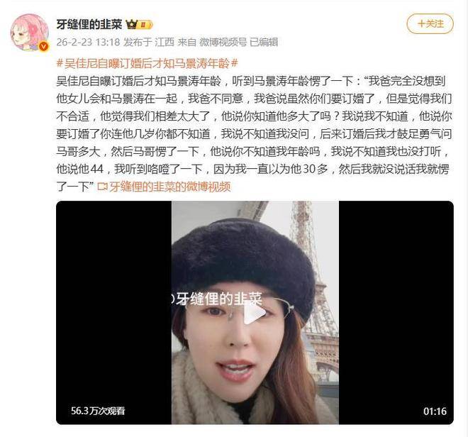 我以为他30多岁这句话,犹如一颗重磅炸弹,在『社交媒体』上引发了轩然大波。2月23日,吴佳尼在一次直播中爆料,透露了她与马景涛订婚时的惊人往事——她竟然完全不知道对方的真实年龄。直到父亲强烈反对、追问她时,才震惊地发现,两人之间竟相差整整21岁。这一意外揭露,瞬间引起了网友们的热议。