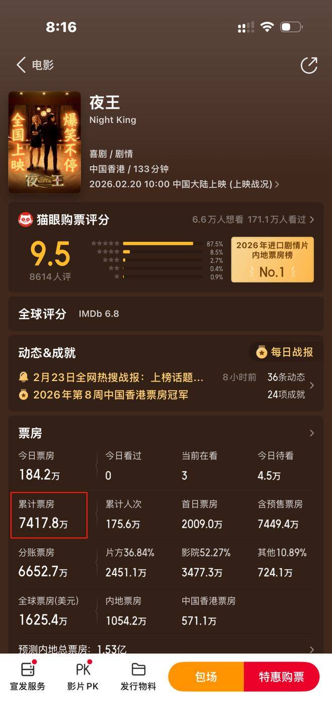 这部电影的尺度相当大,可以说是专门拍给成年人看的。除了频繁出现的粗口之外,许多台词也直白、挑逗,甚至有些句子实在让人难以启齿。比如ji硬心软之类的词汇,都让人心跳加速。导演甚至表示,原本还拍了更具冲击力的情节,但为了春节档的需要已经进行了删减,如果票房突破1亿,他们就打算放出更为劲爆的限制级版本。想象一下,很多观众一听到电影是为成年人量身打造的,瞬间眼睛都亮了,尤其是可以在大银幕上看到这些内容,兴奋感油然而生,排片的呼声也自然高涨。 此外,《夜王》也有着极强的轻松搞笑效果,许多笑点和梗特别适合传播。春节档电影,需要的就是这种让人容易理解并产生共鸣的金句和幽默感。和专业的院线经理聊天后,我也才发现,春节档真正的长尾效应,现在才开始展现出来。经过一周的营销攻势,大家回到工作岗位,终于开始交流真正的电影口碑。那些春节档无法起飞的电影,逐渐被淘汰,而那些值得一看的影片,才会让观众开始为之出手。而此时的《夜王》,无疑正处在口碑爆炸的时机。 其中最吸引我的,不仅仅是黄子华的表演,更多的是老男人谢君豪的帅气和专门负责金句的杨伟伦的独特魅力。强烈建议成年人都去看一下! 最后说到票房,就不得不提这部电影的成本。电影的主要场景几乎都设置在室内,不是夜总会就是赌场,再加上一个天台和几间房间,整体看起来并不需要太高的制作成本。和《满江红》相比,《夜王》的成本差不多。要知道,这样的电影,制作花费不大,但内地和香港的宣传闹腾一番之后,估计《夜王》有可能成为春节档回本最快的电影。