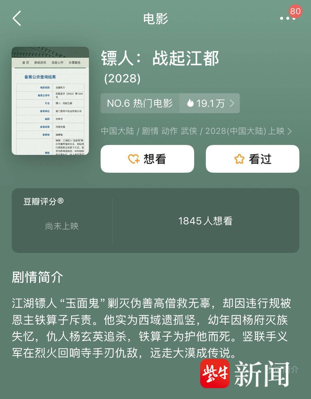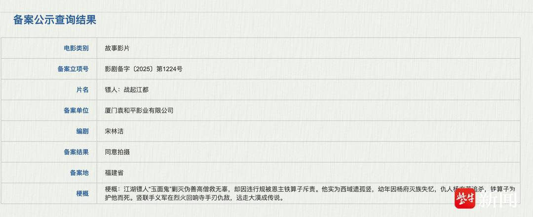 好消息来了,记者从国家电影局官网看到,以竖为主角🎭️的系列新作《镖人:战起江都》已于2025年6月备案立项,备案号为影剧备字〔2025〕第1224号,由厦门袁和平影业有限公司备案出品。该公司正是《镖人:风起大漠》的第一出品方。