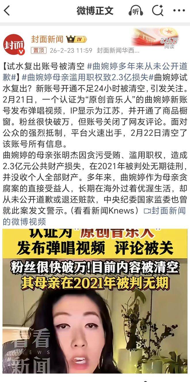 曲婉婷新账号上线不到一天便被清空,迅速成为『社交平台』上的热议话题。这位曾凭借《我的歌声里》一曲走红的歌手,原本打算复出,却在起步阶段就被彻底打压,背后的原因正是公众情绪与规则底线的双重作用。这场复出试水,连一天都未撑住。她被抵制的根源,实际上是她与母亲贪腐案件之间无法割舍的联系。