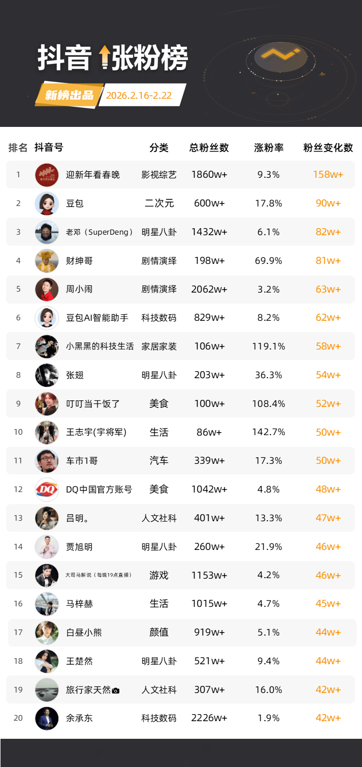 依托新榜数据,新榜推出「『抖音』涨粉榜」,每周一期。本次统计周期为2026年2月16日到2026年2月22日。