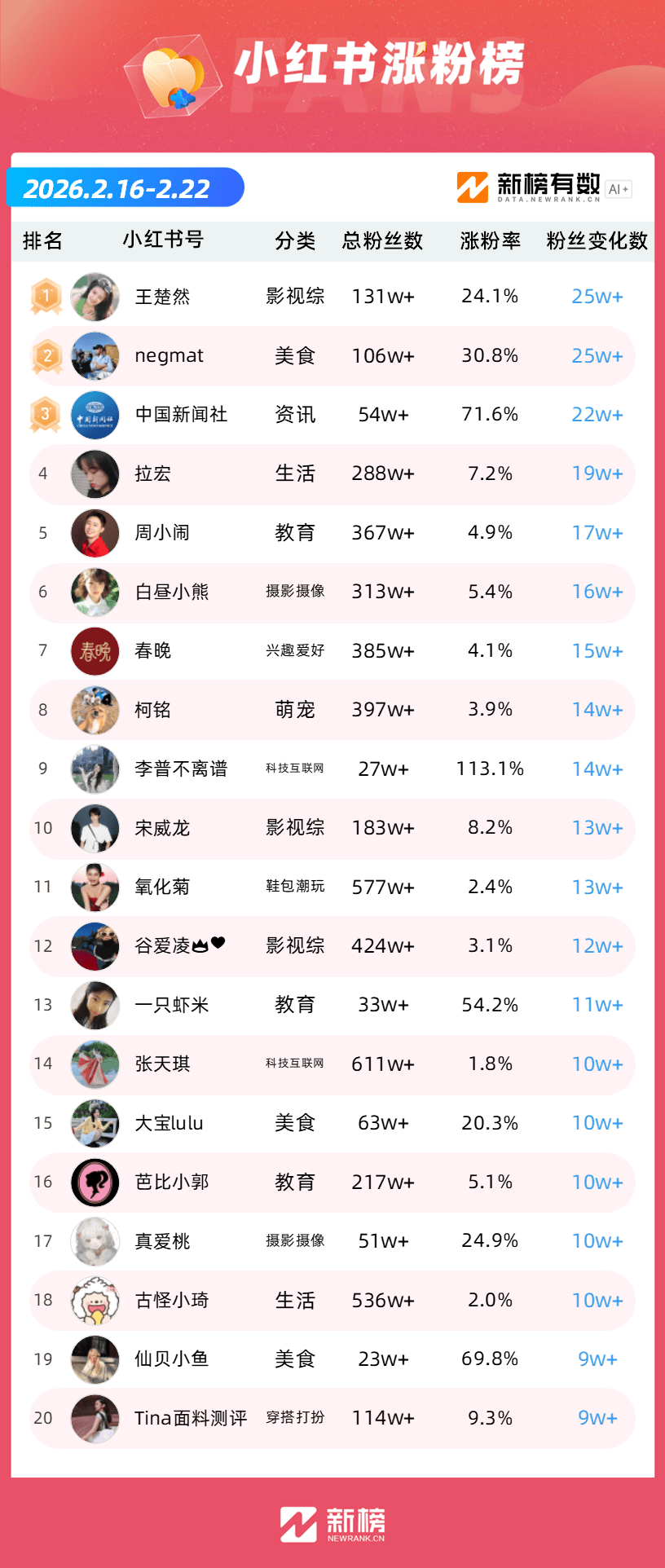 依托新榜数据,新榜推出「小红书涨粉榜」,本次统计周期为2026年2月16日到2026年2月22日。