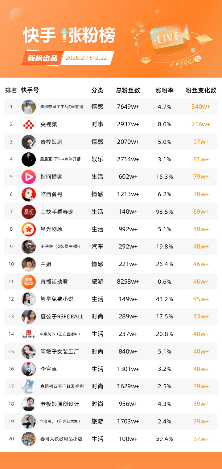 依托新榜数据工具,新榜推出「快手涨粉榜」,本次统计周期为2026年2月16日到2026年2月22日。