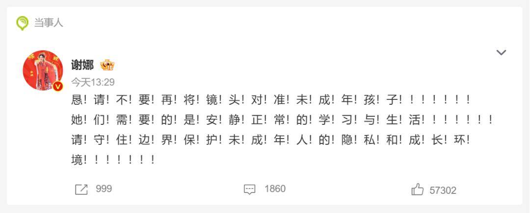25日午间,『谢娜』发文呼吁恳请不要再将镜头对准未成年孩子,“请守住边界保护未成年人的隐私和成长环境”,并连发68个感叹号。