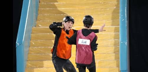 播出时间也十分友好,每周日泰国时间18:00播出;在内容模式上,节目延续了《跑男》IP经典的对抗任务与游戏挑战,首期就设置了积分赛、道具争夺、水上弹椅惩罚等多个环节,最终以大家熟悉的“撕名牌”环节决胜,既保留了IP的核心魅力,又加入了满满的泰式趣味。