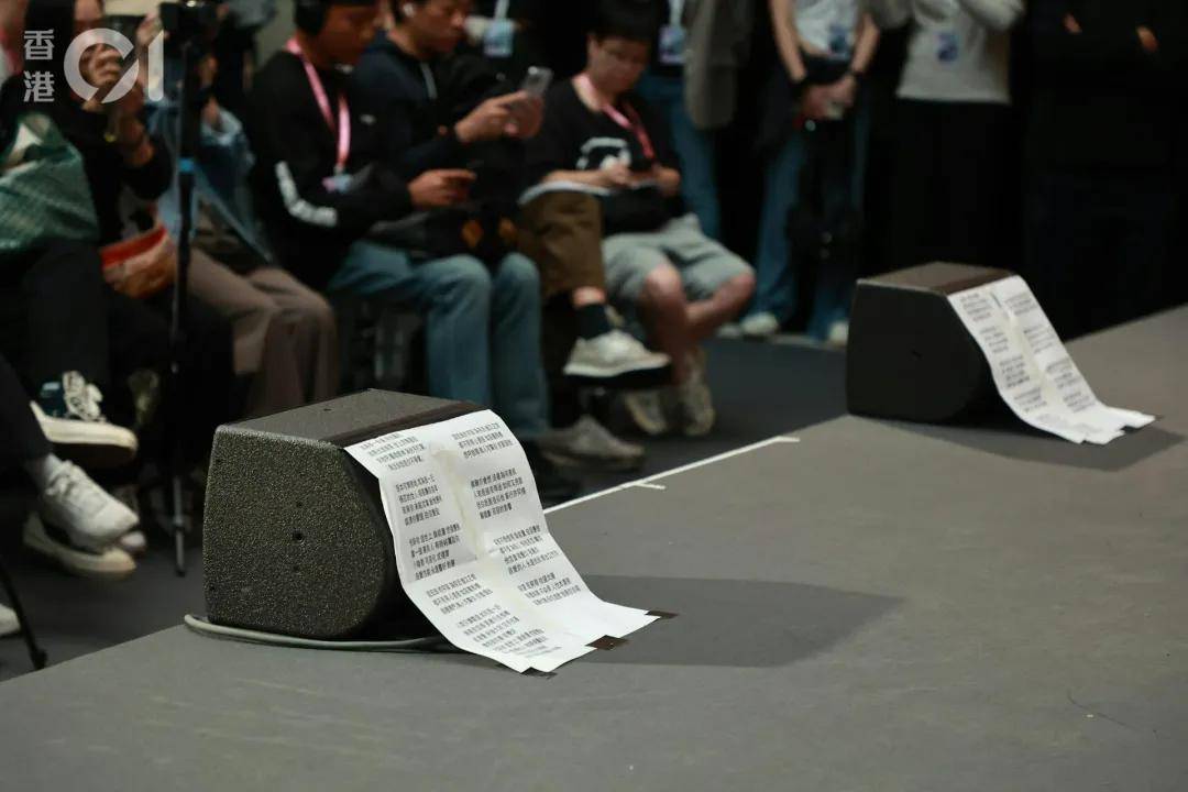 在台上的表演環節中,姜濤特意為大家送上新歌的原版演繹。或許是因為首次現場演唱這首難度頗高的歌曲,加上心情緊張,姜濤大方承認表演時有些許忘記歌詞(甩咳)。他笑着解釋:「係啊,貼咗歌詞喺後面,都有啲耐冇唱呢首歌。」有記者問「睇唔睇到歌詞」,姜濤又笑言:「我戴咗con。」記者再問,歌詞是不是較難記,他也回答:「又唔難記嘅,純粹係慣咗有提字機。」《香港01》觀察到,台下喇叭位置貼着兩張歌詞。