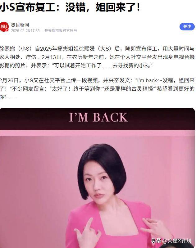 然而,就在汪家沉浸在添丁进口的喜悦中时,一直沉默的妹妹小S突然发起了大动作。2月26日,小S在『社交平台』发布了一段视频,并配文宣告:I’m back~没错,姐.回.来.了!自从姐姐大S突然离世以来,小S仿佛失去了生活的重心,连主持了多年的节目《