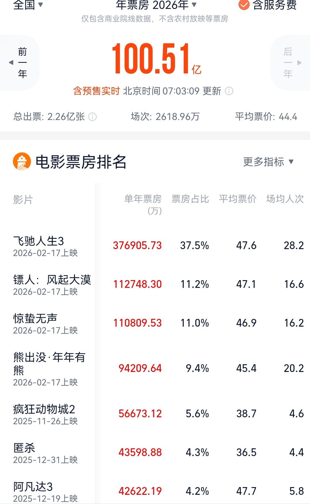 搜狐娱乐讯 (哈麦/文)截止3月1日,2026年全国电影总票房突破了100亿元。