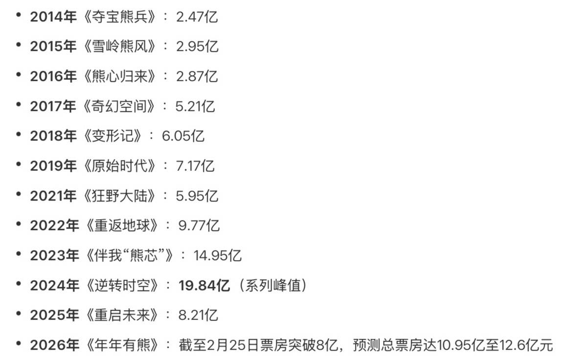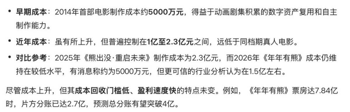 它完全不需要花费数千万甚至上亿的片酬去请流量『明星』️,也不必为演员的档期、翻车等风险担忧,也不用承担真人拍摄可能带来的不确定性。一个成熟的IP加上一支稳定的制作团队,便能稳稳当当地做出一部稳赚不赔的影片。 小成本撬动高回报,这才是真正的空手套🧤白狼。在如今浮躁的电影市场中,很多项目一开始就打算砸大钱、赌爆款、冲热搜,把热度当作一切,结果往往是票房高、利润薄、口碑崩,赚了眼前的热闹,赔了长久的口碑。 《熊出没》最聪明的地方就在于它从不迷失方向。不跟风、不炒作、不硬蹭热点、不消耗观众的情怀。它每年都脚踏实地做一件事:在亲子赛道做一部合格、稳定、好看的春节动画。 如今,熊出没这三个字本身就成为了最好的宣传口碑。家长看到这个IP,便愿意带着孩子走进电影院🎦。这种天然的信任,远比导演的惊艳表现、演员的拼尽全力更能吸引观众。 虽然《熊出没》很难成为春节档的票房头号热门,但随着院线电影市场的逐渐遇冷,电影的口碑和成绩逐步下滑,它的优势越发凸显:稳定、低风险、高回报。