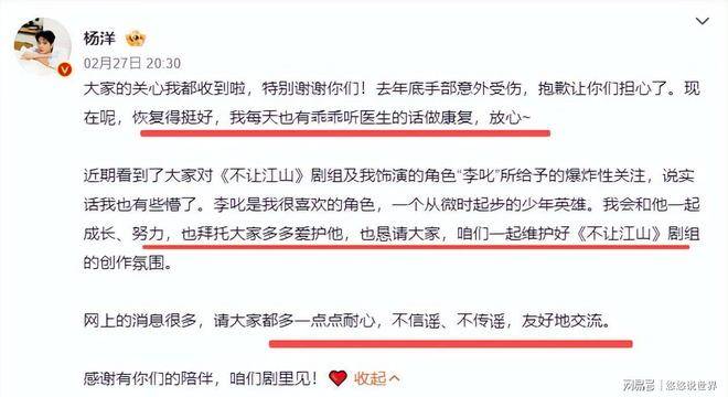 不让江山》这种古装剧,武打戏、骑马戏、甚至是抓握道具的场景一个也不能少。手部骨折,无论对于男主角🎭️的发挥还是拍摄效果,都会带来极大的影响。大家都在心里问,『杨洋』能否撑得住?