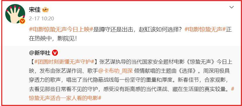 紧接着她又高调宣布她主演的电影《惊蛰无声》上映,而这部电影由『张艺谋』执导,由『宋佳』和『朱一龙』、『易烊千玺』、雷佳音等人主演。