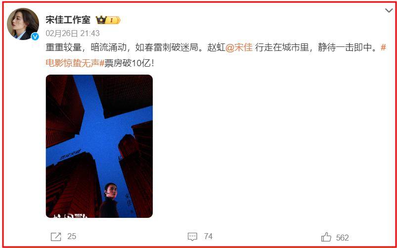 到了2月26日,『宋佳』又让工作室发布了一条喜讯,这条喜讯便是《惊蛰无声》票房破10亿了。