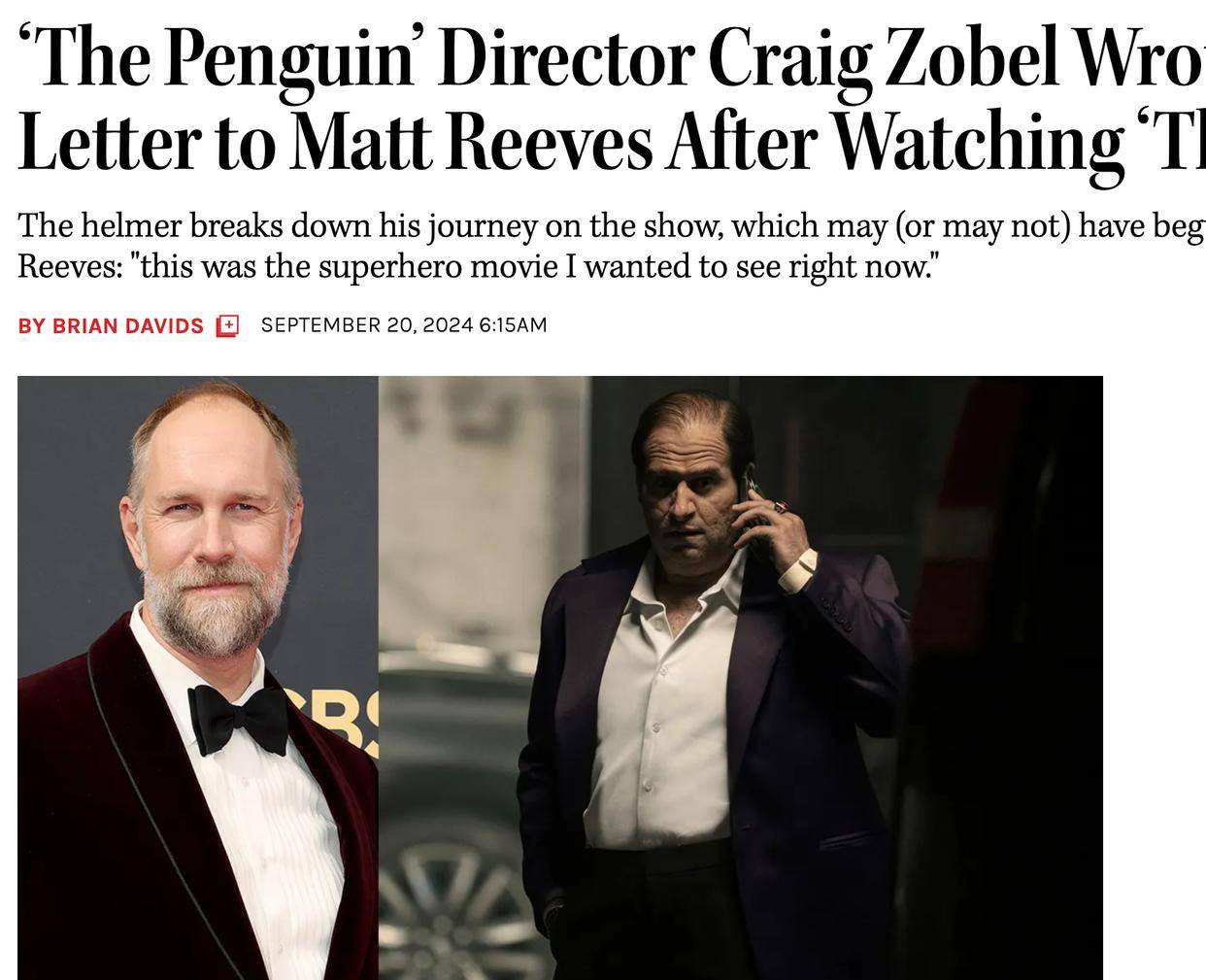 《企鹅人》的导演克雷格·卓贝观看了新版《蝙蝠侠》,他给马特·里夫斯写了一封信,信中充满了“粉丝对偶像的崇拜之情”。《THR》的记者戴维斯透露,卓贝在信中谈论了自己对《新蝙》的看法,其中的理念比较新颖,他可以成为《蝙蝠侠》系列的创作者之一。戴维斯表示:卓贝的理念适合《新蝙》,从詹姆斯·古恩的计划来看,DC工作室将要牢牢把握热门英雄,新版《蝙蝠侠》多半要按照三部曲的模式进行创作。如果里夫斯与DC影业没有续约,《新蝙》的第三部系列可以聘用卓贝。这位创作者的理念非常复杂,这些细节体现在《东城梦魇》当中,这部电影是卓贝的代表作,他的理念适合新版《蝙蝠侠》。