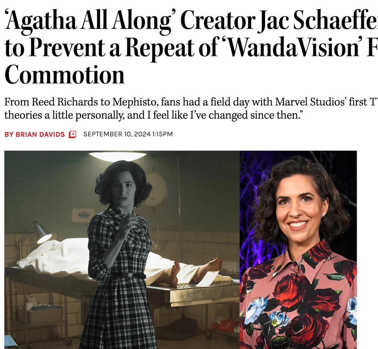 《阿加莎》和《黑寡妇》的编剧雅克·舍费尔接受了戴维斯的专访,她透露自己的未来计划——舍费尔加入《旺达幻视》的团队,她要为这部剧集的续集重塑人物形象。舍费尔认为《旺达幻视》的首部系列就像情景喜剧,虽说宇宙电影不需要“英雄感”那么充足,但是此类作品不能远离超级英雄系列的本质。舍费尔加入漫威工作组之后,她也承认迪士尼频道的宣传团队非常复杂,《旺达幻视》能够得到很好的宣传、包装,不过这种宣传通常会偏离本质,这也是舍费尔担心的事情。《夜魔侠》也受到过此类问题的困扰,所以舍费尔希望MCU工作组能够成立全新的团队,凯文费奇有可能要承担更多责任。