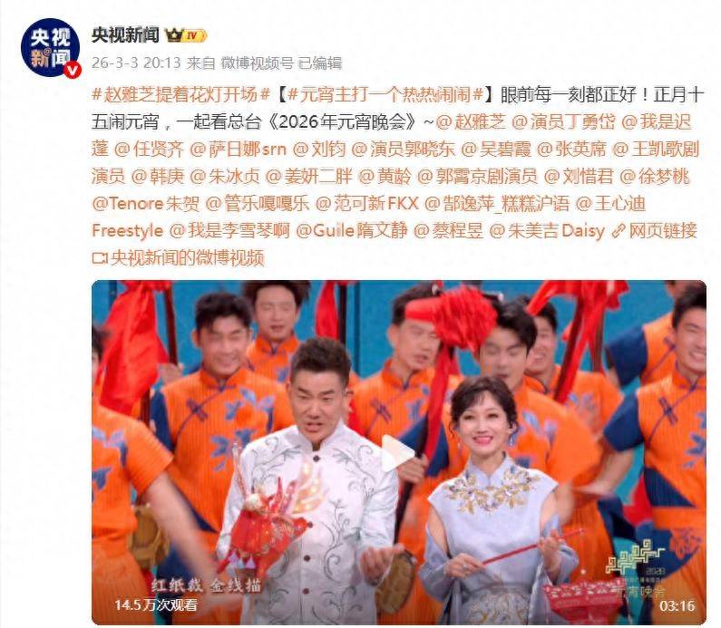 3月3日晚间,央视元宵晚会一开场就“放大招”。歌舞《元宵正好》以众星云集的热闹场面瞬间点燃节日氛围,两大看点更是直接引爆网络:72岁的赵雅芝优雅登场惊艳全场,奥运冠军夫妇徐梦桃与王心迪在台上的甜蜜对视,被网友直呼“太好嗑”!
