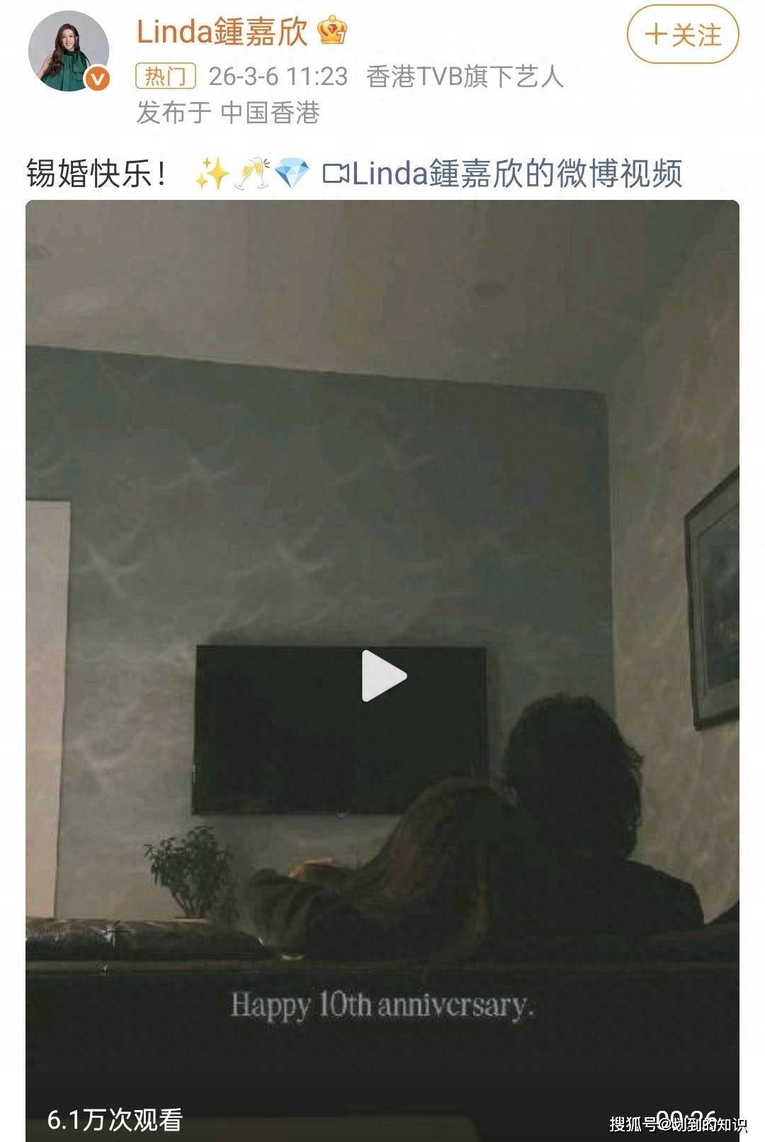 结婚十周年,夫妻俩还是非常有仪式感的。只见钟嘉欣与老公Jeremy特地一起坐在了沙发上,用镜头记录两人的背影。