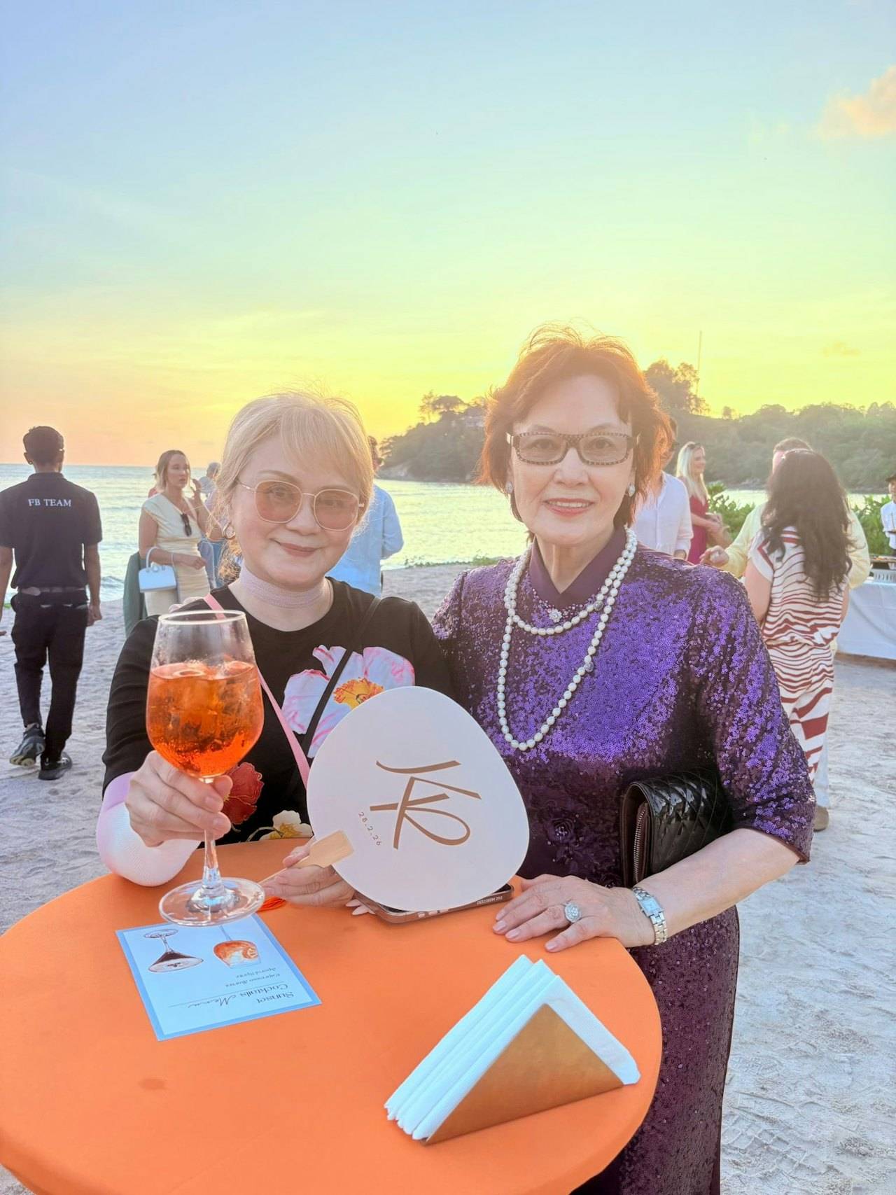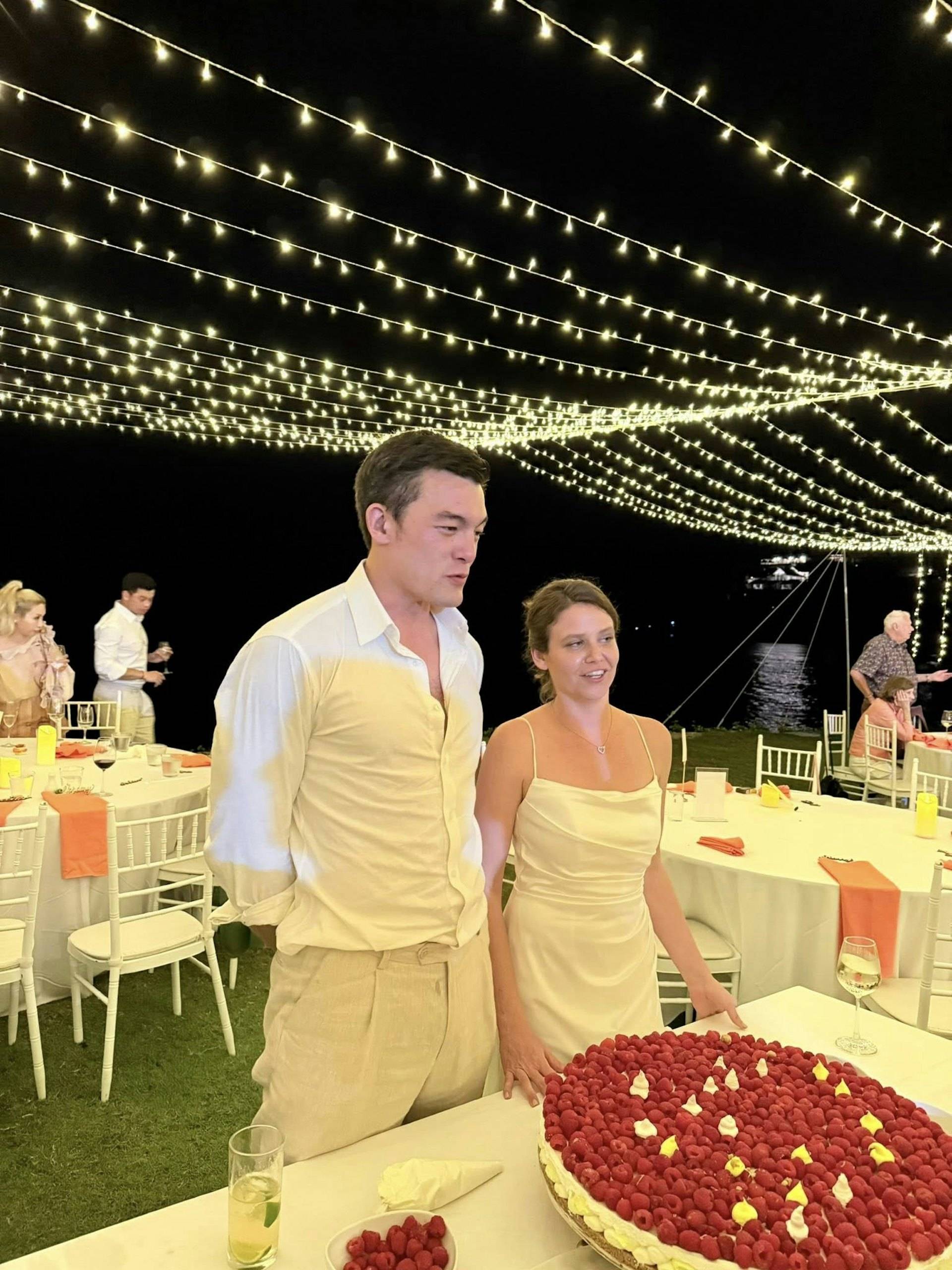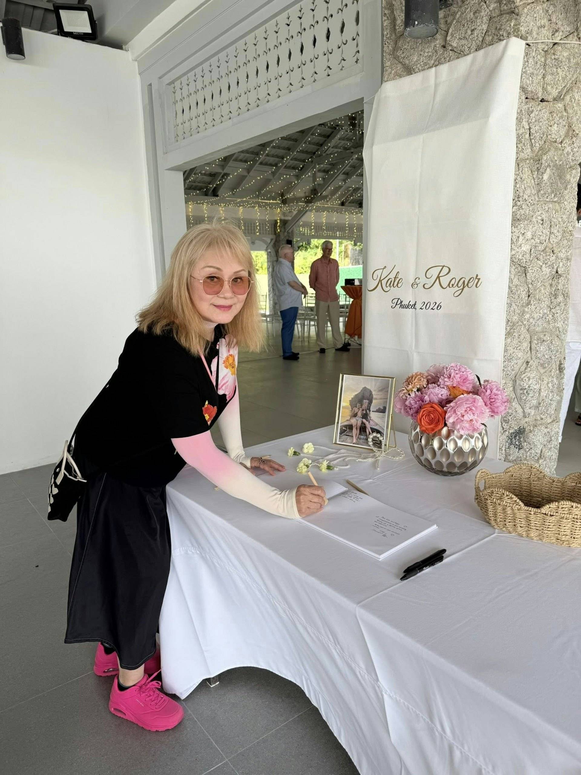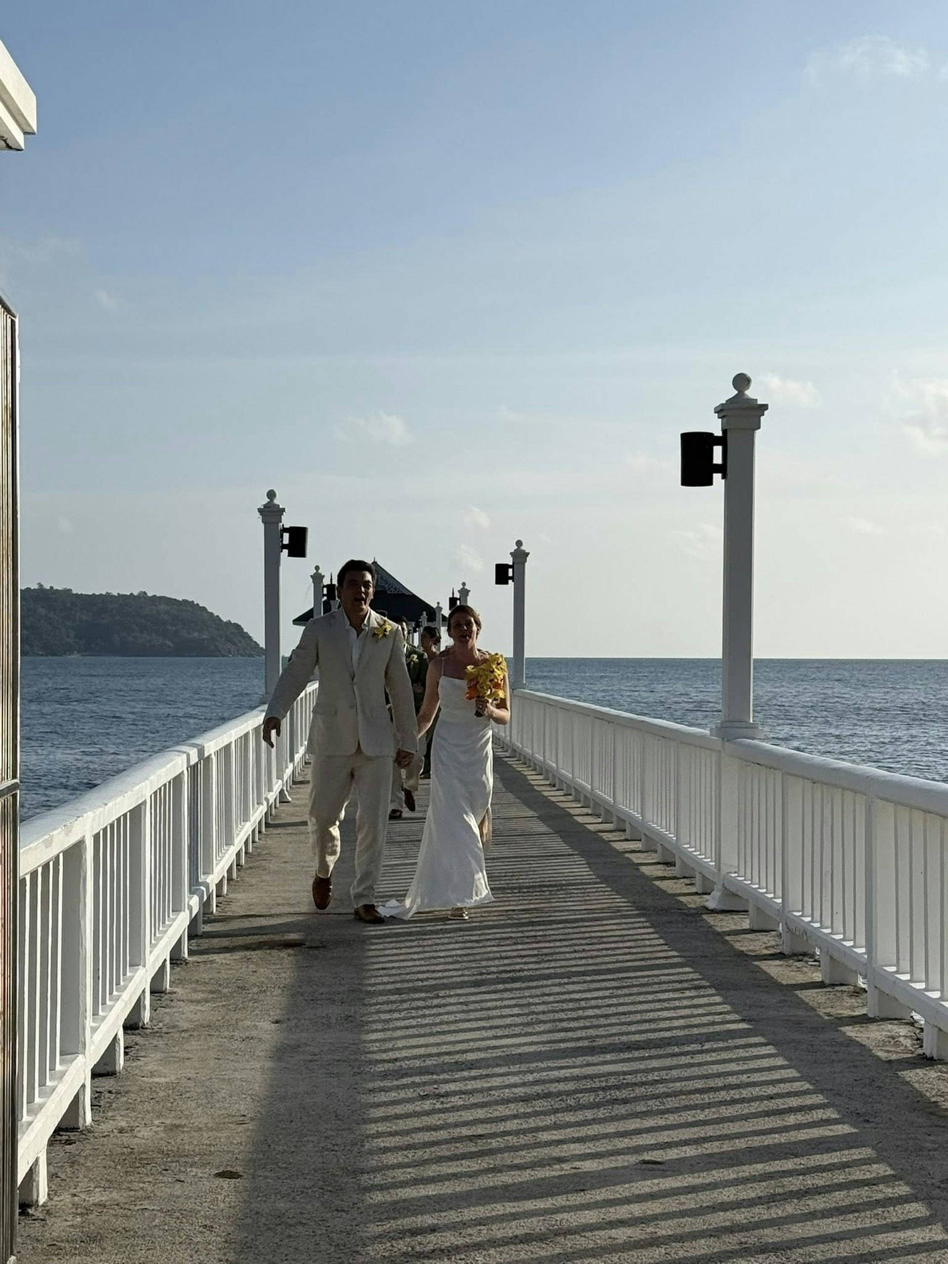 Roger的婚礼是在海边举办的,婚礼仪式的地点在海中,需要通过一条白色的桥才能抵达,而桥的两边是蔚蓝的大海,相当浪漫。Roger穿上了白色的休闲西装,搭配了白色衬衣,没有打领带👔,而其妻子穿的是白色的吊带婚纱,捧着黄色的花球,总之夫妻俩的『打扮』都比较简约,主打休闲、优雅。Roger牵着妻子的手走过白色长桥抵达仪式现场,接受祝福,完成宣誓。仪式结束之后,众人在沙滩举办黄昏酒会——这大概也是他们会选择在泰国海岛举办婚礼的原因,走的就是休闲婚礼的路线,有落日晚霞,有海风沙滩,大家手持香槟,享受美食,自由自在。