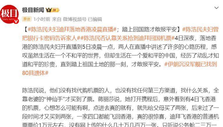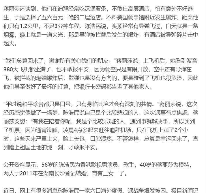 陈浩民和蒋丽莎在登上从迪拜飞回香港的飞机前把银行卡密码全都告诉了其他家人,这不是开玩笑,是真的。 蒋丽莎后来在直播里说,因为领空只是有限开放,天上还有导弹在飞,被拦截的炮弹炸开后,碎片乱飞,谁也不知道会不会打到飞机。