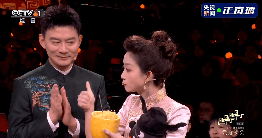△2026总台元宵晚会,主持人品尝金丝绞瓜。