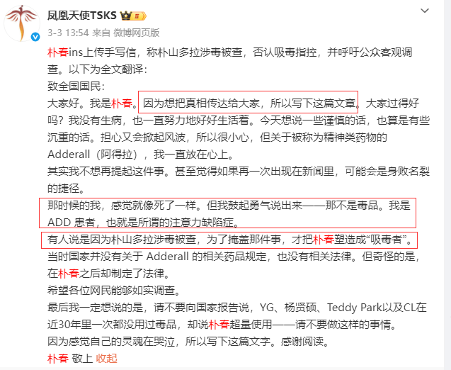 尤其3月4日,朴山多拉在自己的SNS上亲自回应:“我没有吸过毒,希望她健康。”
