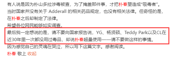 但问题出在,她为自己辩解OK,偏偏信里插了一句:“有人说是因为朴山多拉涉毒被查,为了掩盖那件事,才把朴春塑造成‘吸毒者’。”